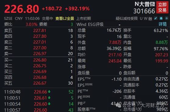 今日三只新股上市,集成电路板块的N大普微上市飙涨超400%,市值一度破1000亿元。大普微是创业板第三套上市标准启用后,首家成功上市的未盈利企业。