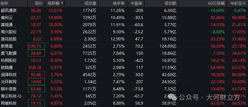 算力租赁板块集体上扬。超讯通信、美利云、真视通、南兴股份涨停,协创数据涨超8%股价创历史新高。欧陆通、杭钢股份、青云科技、新易盛等跟涨。