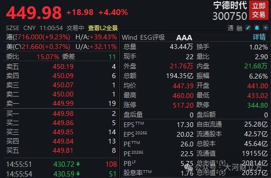 宁德时代今日颇为抢眼,盘中涨幅一度扩大至6%,A股总市值超2万亿元,跃居A股总市值第二位,今日成交额超200亿元位居全市场第一。