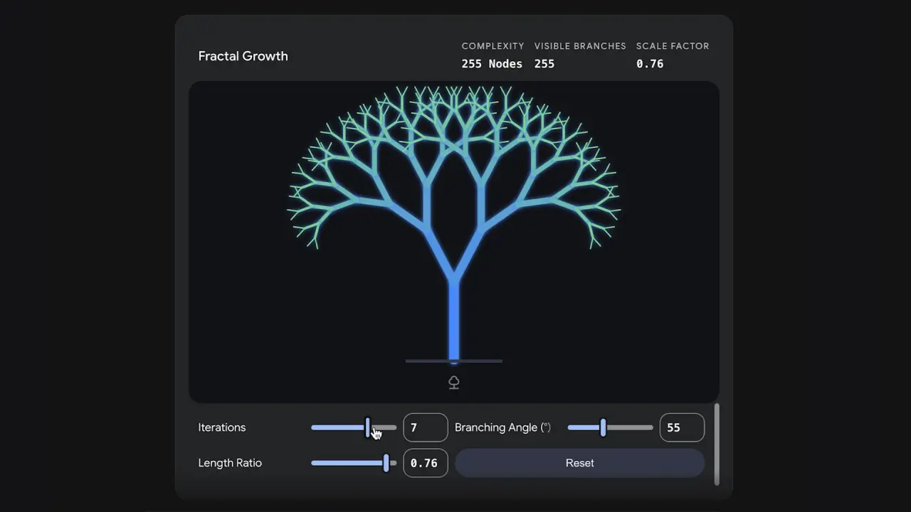 在使用方式上,用户只需在提示中加入“向我展示(show me)”或“帮我可视化(help me visualize)”等指令,并选择“Pro”模型即可。例如输入“可视化分形的生成过程”,即可看到分形生长,并可调整分支角度、长度比例和迭代次数等参数。