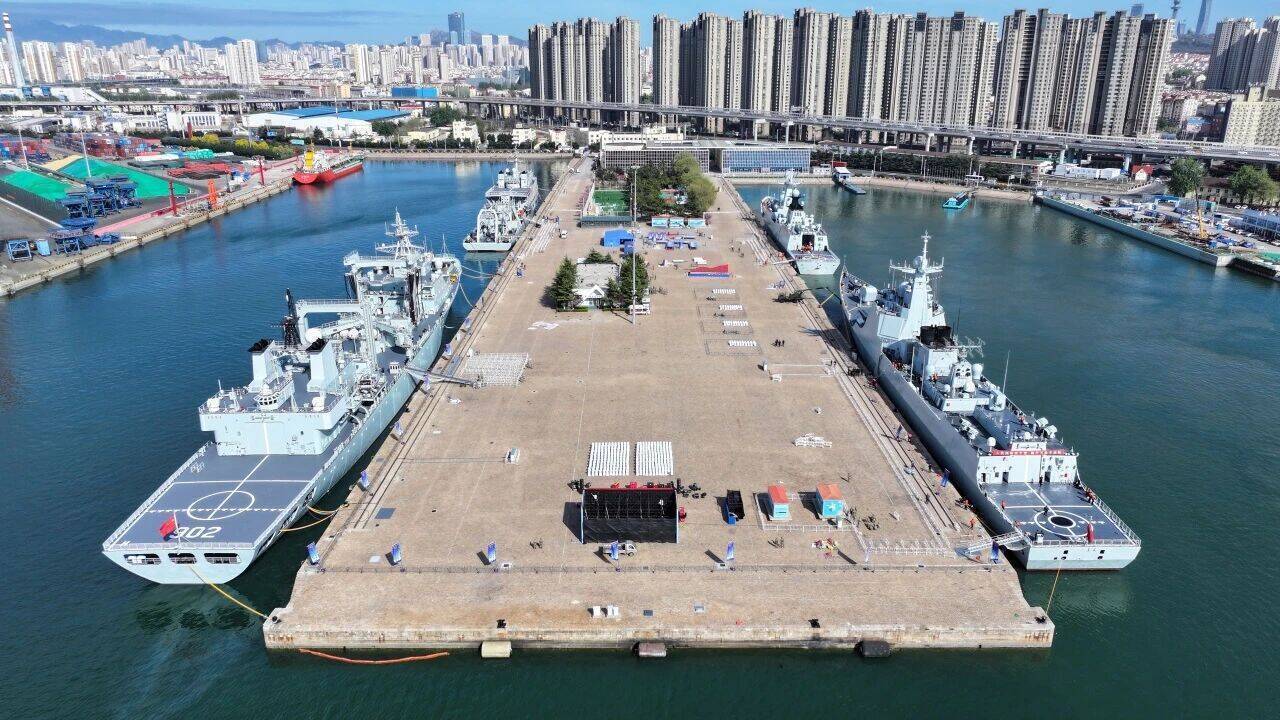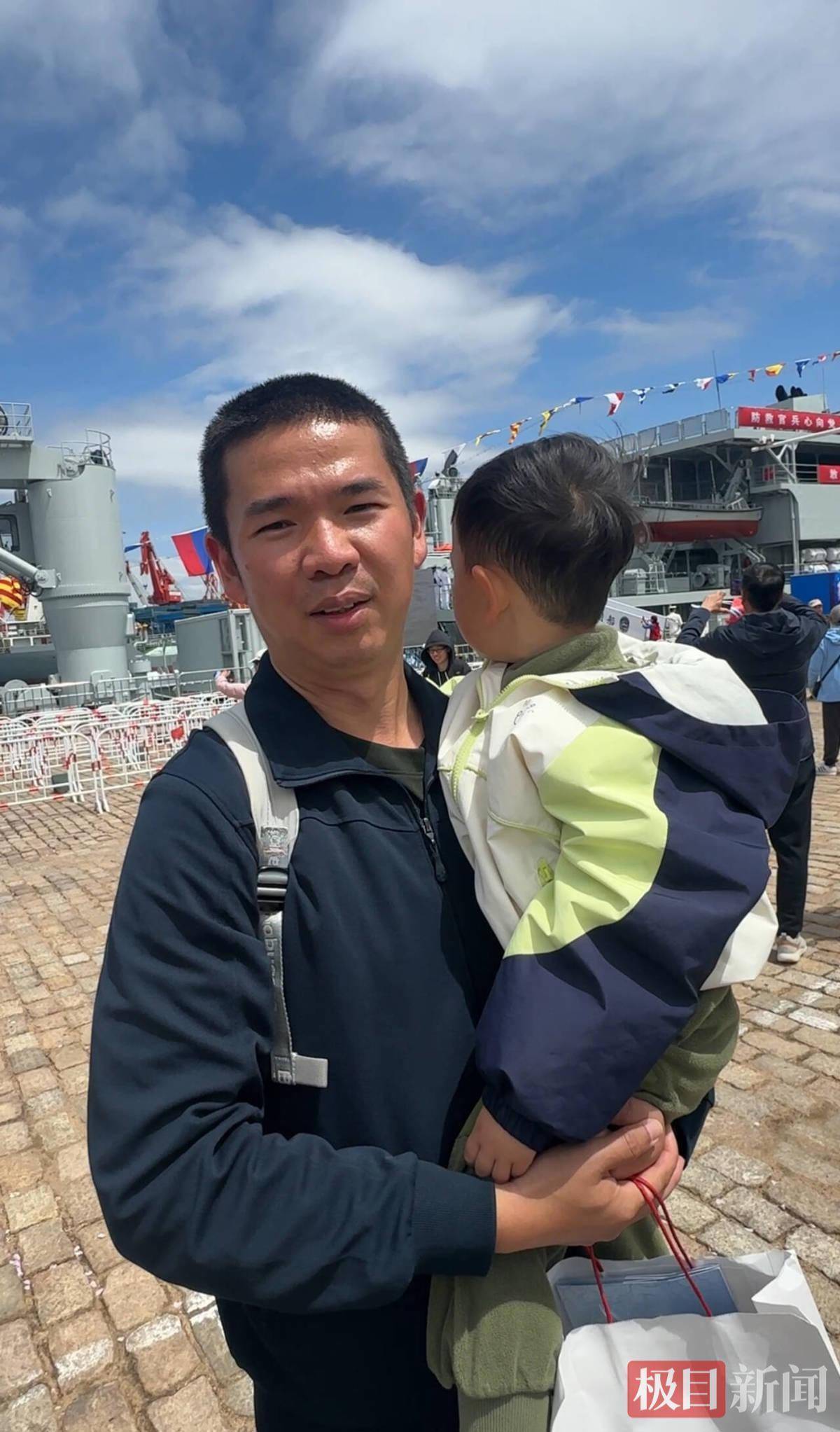 22日,高云峰身穿一件体能服,抱着孩子来到青岛港三号码头。他说,“近距离”感受军舰,和在屏幕上观看很不一样。“明年有机会的话,我想带着学校的同学们一起来参观,带着他们接受国防教育。”高云峰表示,这次参观结束后,还要回去和学校的孩子们分享这次体验,“真的非常激动、非常自豪。”