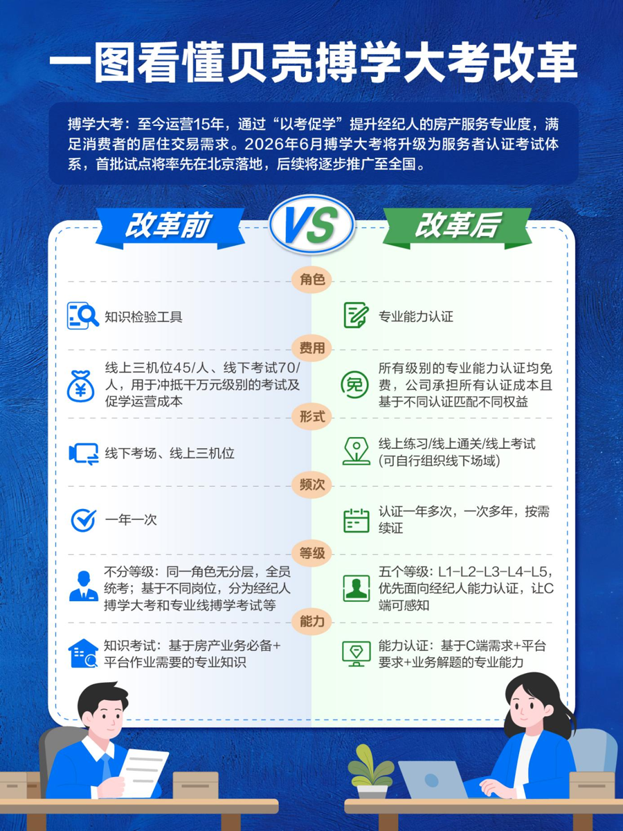 4月27日,贝壳正式宣布,将于2026年6月对原有搏学大考进行全面改革,将其升级为服务者认证体系。该体系首批试点率先在北京落地,后续将逐步推广至全国,惠及平台约50万房产服务者。